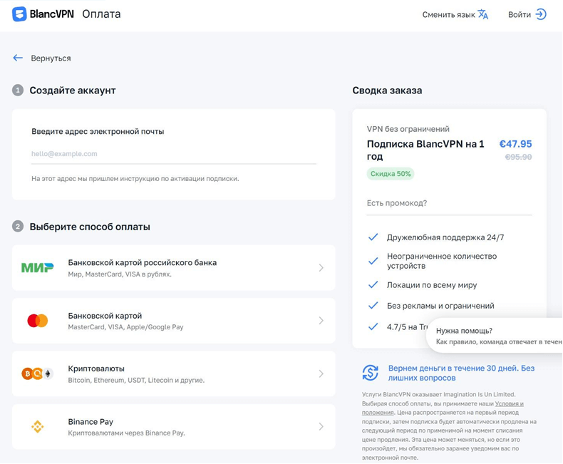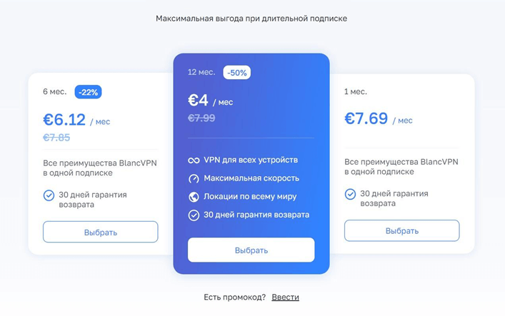 Если у вас ещё нет аккаунта BlancVPN, нажмите “Купить”. Без покупки актуального тарифного плана пользоваться сервисом не получится.